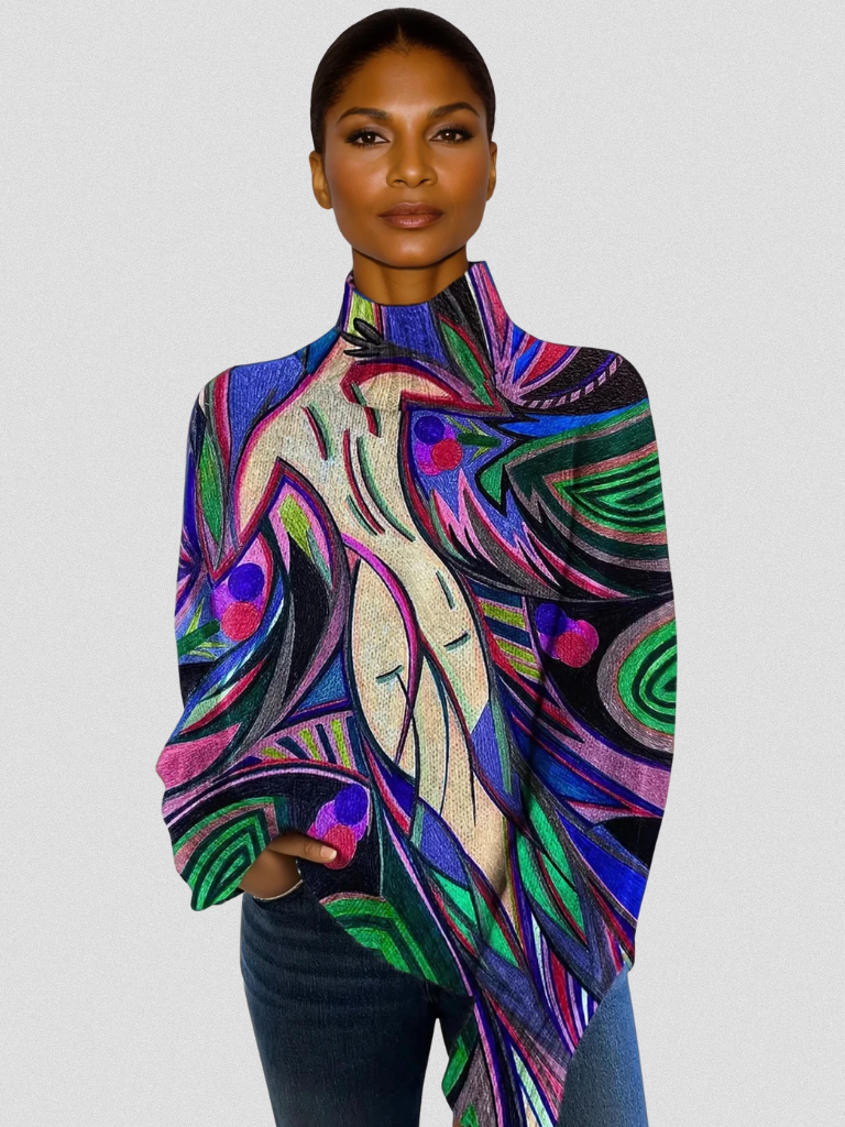 Designed for women who love style with personality, this statement sweater pairs effortlessly with denim, tailored pants, or a simple winter coat. The relaxed fit drapes beautifully on every body, and the high mock neck adds just the right touch of elegance and coziness.